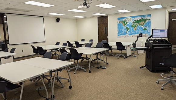 The active learning classroom (4068 Wescoe) contains a movable instructor podium and reconfigurable tables that seat up to 24 students. There is a 24’ of whiteboard directly behind the instructor.